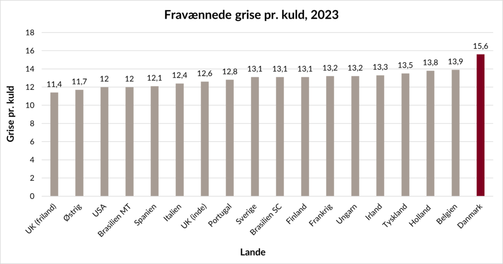 Danmark er klart i toppen ift. antal fravænnede grise pr. kuld. I 2023 fravænnede de danske søer i gennemsnit 15,6 grise pr. kuld, det er en fremgang på 0,3 grise pr. kuld ift. i 2022. Belgien tager andenpladsen med 13,9 fravænnede grise pr. kuld, dvs. 1,7 grise færre pr. kuld end Danmark.