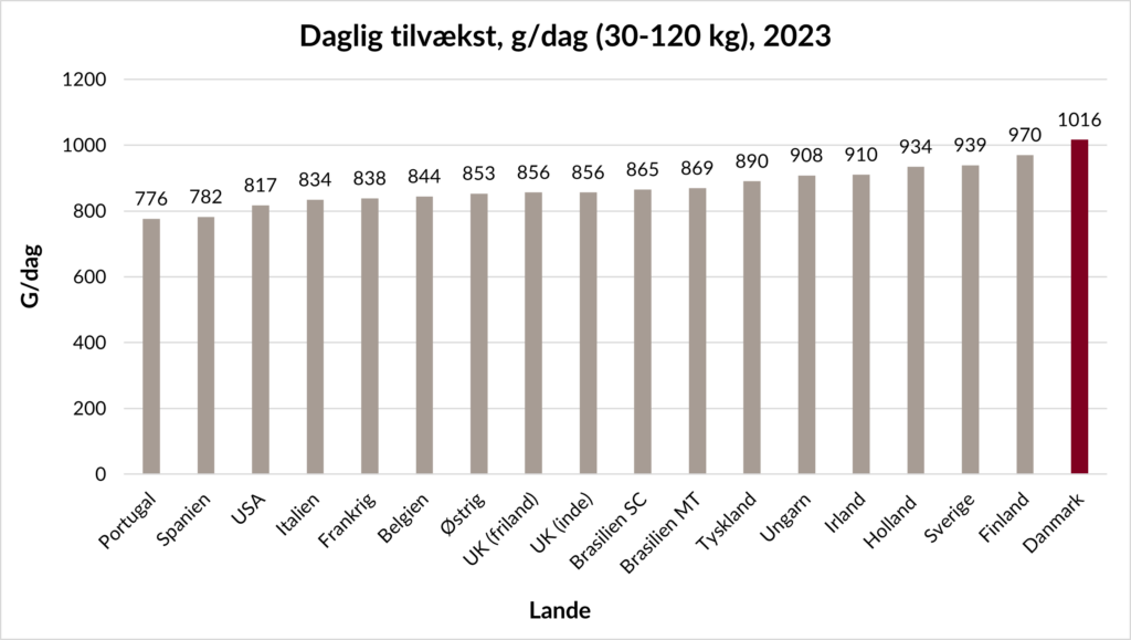 Danmark er også den klare vinder, når vi kigger på daglig tilvækst. Hvilket yderligere understreger den enormt høje effektivitet i dansk griseproduktion.