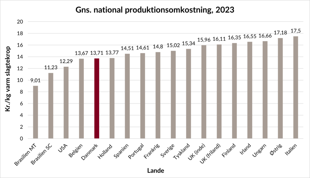 Trods højere priser og lønninger udmærker Danmark sig på produktionsomkostninger. Selvom vi ikke kan slå lande som Brasilien og USA, så har vi nogle af de laveste produktionsomkostninger, når vi sammenligner os med de europæiske lande – her er det kun Belgien, der teknisk set har lavere produktionsomkostninger end Danmark (Belgiens data er dog baseret på et begrænset datagrundlag).