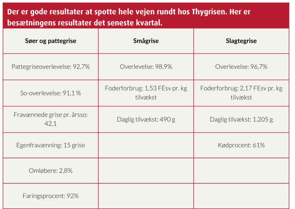 Medarbejderne bruger heller ikke mange kræfter på faringshjælp, da søerne kan klare det selv og kvittere med kun 0,8 dødfødte per kuld. I farestalden er der lovende resultater, og selv de mindste grise klarer sig godt. Samtidig har Thygrisen fravalgt at kastrere, hverken medicinsk eller kirurgisk.