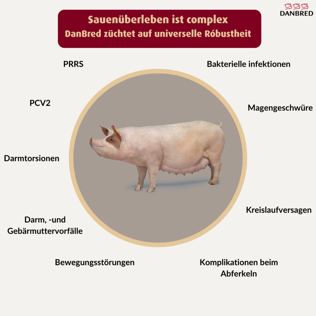 DanBred verfolgt ein zielgerichtetes Zuchtziel, das bedeutet, direkt auf das eigentliche Ziel zu züchten – in diesem Fall mehr überlebende Ferkel, unabhängig von Ursache oder Grund der Mortalität. DanBred möchte eine umfassende Robustheit gegenüber allen Mortalitätsursachen verbessern.