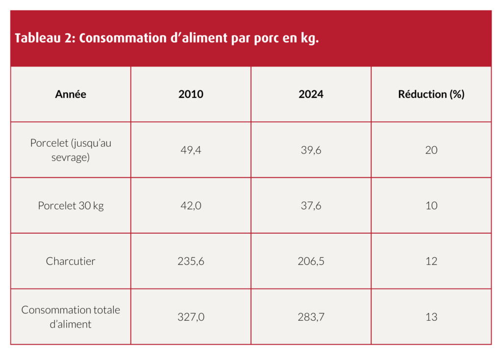 Les charcutiers DanBred consomment 29 kg d’aliment de moins en engraissement qu’il y a 14 ans. Cela correspond à une économie d’aliment de 12 %, ce qui est la principale raison de l’empreinte climatique décroissante du porc. La meilleure efficacité alimentaire entraine aussi une moindre émission de méthane entérique et d’autres gaz à effet de serre, car moins de lisier est produit par porc.
