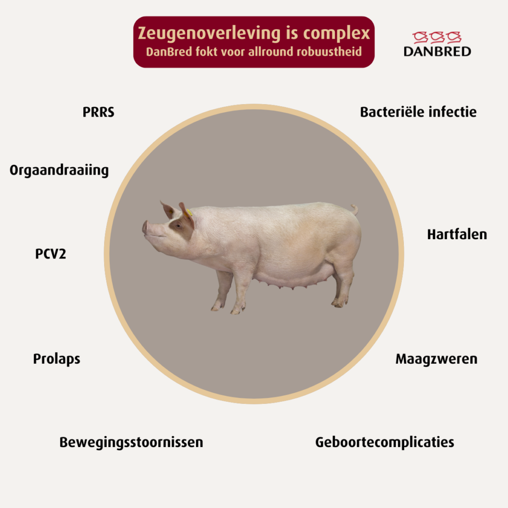 Het uitgebalanceerde fokdoel van DanBred legt de nadruk op verbeterde prestaties, terwijl ook prioriteit wordt gegeven aan overleving en conformatie (lichaamsbouw). Deze verbeteren direct de algehele robuustheid van de varkens. Door te fokken op overleving stimuleren we de universele robuustheid; we selecteren op een sterkere immuniteit en veerkracht, wat een betere gezondheid en een langere levensduur van zowel zeugen als biggen ondersteunt.