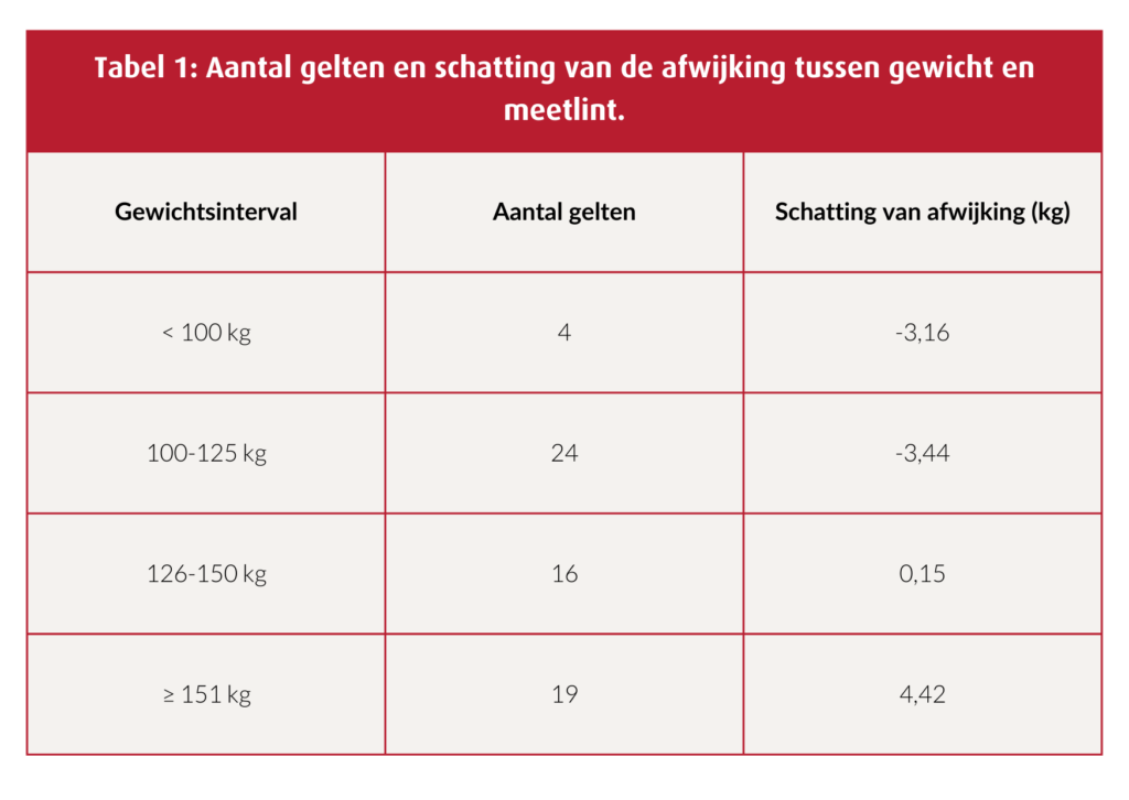 Het meetlint van DanBred kan worden gebruikt als alternatief voor het wegen van de gelt. DanBred-gelten moeten worden gedekt wanneer ze tussen de 150 en 165 kg wegen, wat duidelijk op het lint staat aangegeven. Het lint is een eenvoudig en veilig hulpmiddel wanneer het wegen van gelten niet mogelijk is.