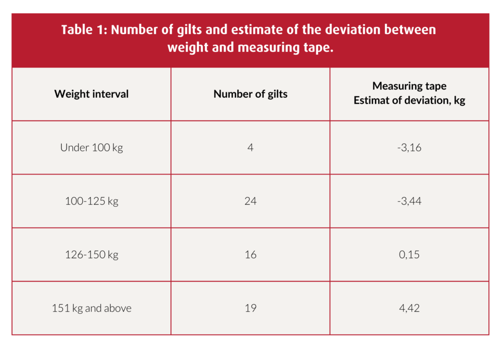 DanBred recommendations on giltsGilts should weigh 150–165 kg at first service to ensure good longevity.Gilts should be fed restrictively with phase feeding to achieve the correct weight and backfat thickness.Use gilt service age—aim for 211–230 days—if you are unable to weigh them or do not have a measuring tape. |
